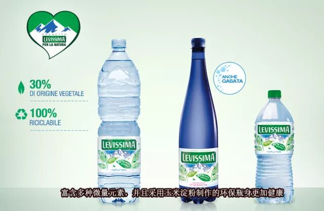 Levissima Lalitro矿泉水的PET瓶是业界第一个原料包括25%再生PET的超轻量化PET瓶。
